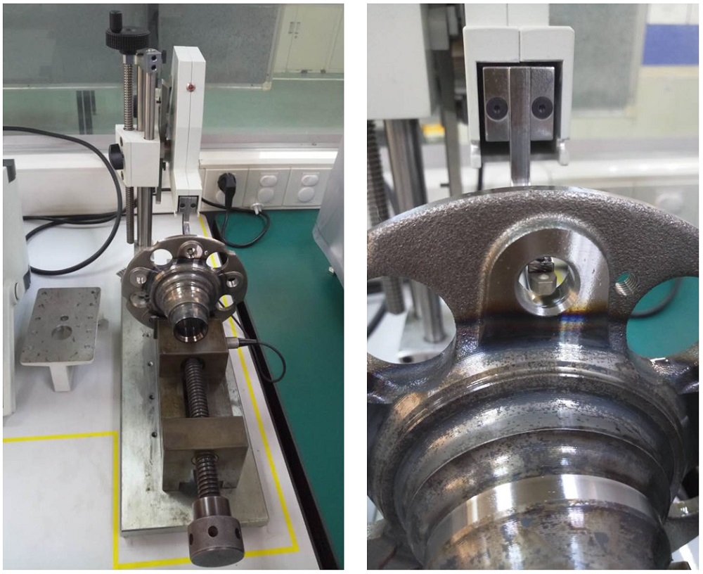 汽車上的軸承多種多樣,對各個部件的要求的也都十分嚴格。因為某一個部件一點小的性能差別都可能造成可靠隱患。 汽車軸承上的一些固定的用的螺栓孔也是非常重要的,不僅要求孔的尺寸和定位精度,同時對加工時的質(zhì)量也有很高的要求。要求孔在加工的過程中不能產(chǎn)生加工硬化,以免對整個零件的長期穩(wěn)定性產(chǎn)生影響。那么檢查是否有加工硬化產(chǎn)生又能不破壞零件,好的辦法就是采用小載荷的維氏硬度檢測。但是由于孔洞的尺寸一般只有十幾個毫米,想要進行維氏硬度測試是很難實現(xiàn)的。 恩斯特的MTR硬度計就能很好的解決孔洞內(nèi)側(cè)硬度測試的難題。