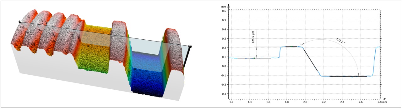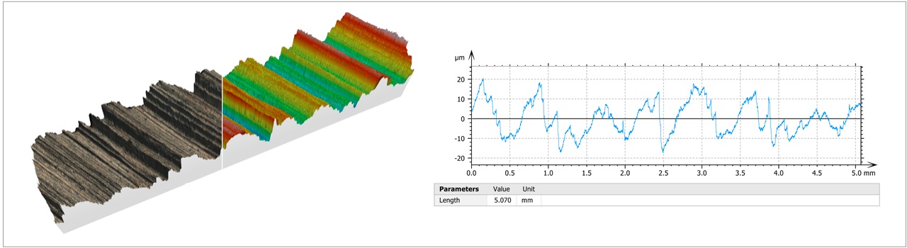 機械加工金屬表面:(左圖)由 20x/0.7 物鏡拍攝的四張真彩表面紋理疊加 3D 彩色編碼高度圖的拼接圖片;(右圖)以垂直于機械加工方向獲取的粗糙度剖面圖,顯示了表面輪廓。