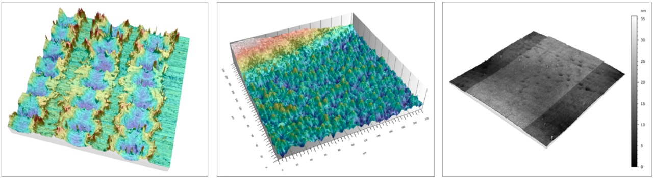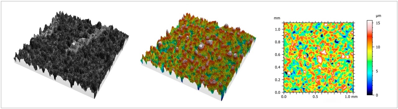 電子設備:(左圖)疊加真彩紋理的三維視圖;(中圖)用 10×/0.4 物鏡創(chuàng)建的高度圖;(右圖)用于測量區(qū)域粗糙度或紋理的二維高度圖,例如用于質(zhì)量控制或確定假冒電子設備。